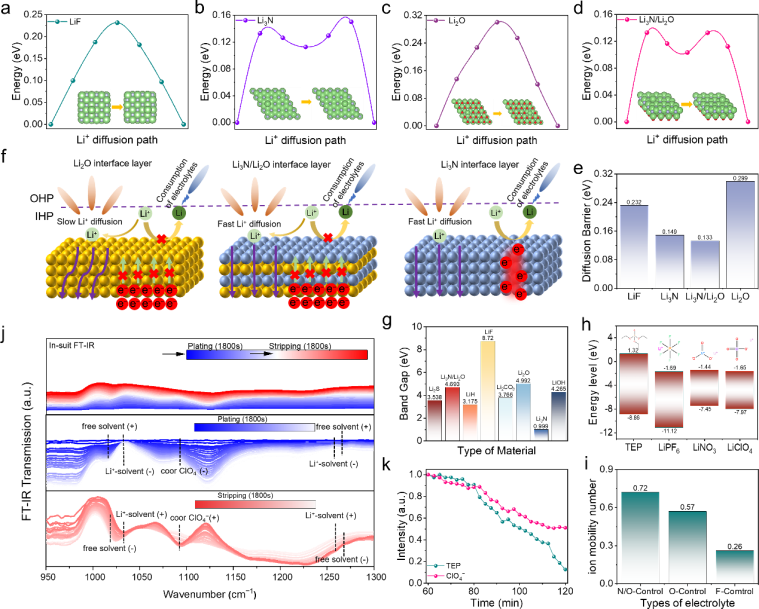 针对锂电池含氟电解液污染的问题,学院青年教师朱晟副教授、徐巾婷博士和巩帅奇博士及其团队,提出通过高氯酸锂和硝酸锂的原位分解构建Li3N/Li2O异质结构界面层,以替代SEI中LiF的作用。该团队的研究表明,Li3N/Li2O异质结构界面层,在实际应用条件下(100 μm锂负极,N/P比为3.09,1.5 Ah软包电池),无氟锂金属电池在100次循环后仍保持77.93%的容量,证明了该策略的优越性和实用价值,相关成果以“Construction of a Fluoride-Free and High-Voltage Lithium Metal Battery with a Li3N/Li2O Heterostructure Solid Electrolyte Interface”为题,发表于国际顶级期刊《Advanced Functional Materials》(JCR一区,IF=18.5)。