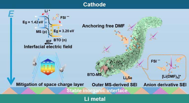 针对目前聚合物固态锂金属电池面临的离子电导率低、倍率性能差的问题,学院青年教师徐巾婷博士、巩帅奇博士和闵宇霖教授及其团队,通过引入多功能异质结铁电填料,在聚合物固态电解质内部打造快速离子传输通道,通过压电、铁电效应抑制锂枝晶的生长。该团队的研究发现,通过在聚合物固态电解质中引入由钛酸钡与二硒化钼制备成的异质结材料,使得Li||LiFePO4(LFP)电池在25°C、5C的高倍率下仍然能够循环超过1500圈,容量保持率达82.6%。这一成果不仅优化了聚合固态电解质中离子传输缓慢的问题,也为快速充放电设备用电池提供了合理的技术支持,相关成果以“Heterojunction ferroelectric materials enhance ion transport and fast charging of polymer solid electrolytes for lithium metal batteries”为题,发表于国际顶级期刊《Advanced Energy Materials》(JCR一区,IF=21.27)。