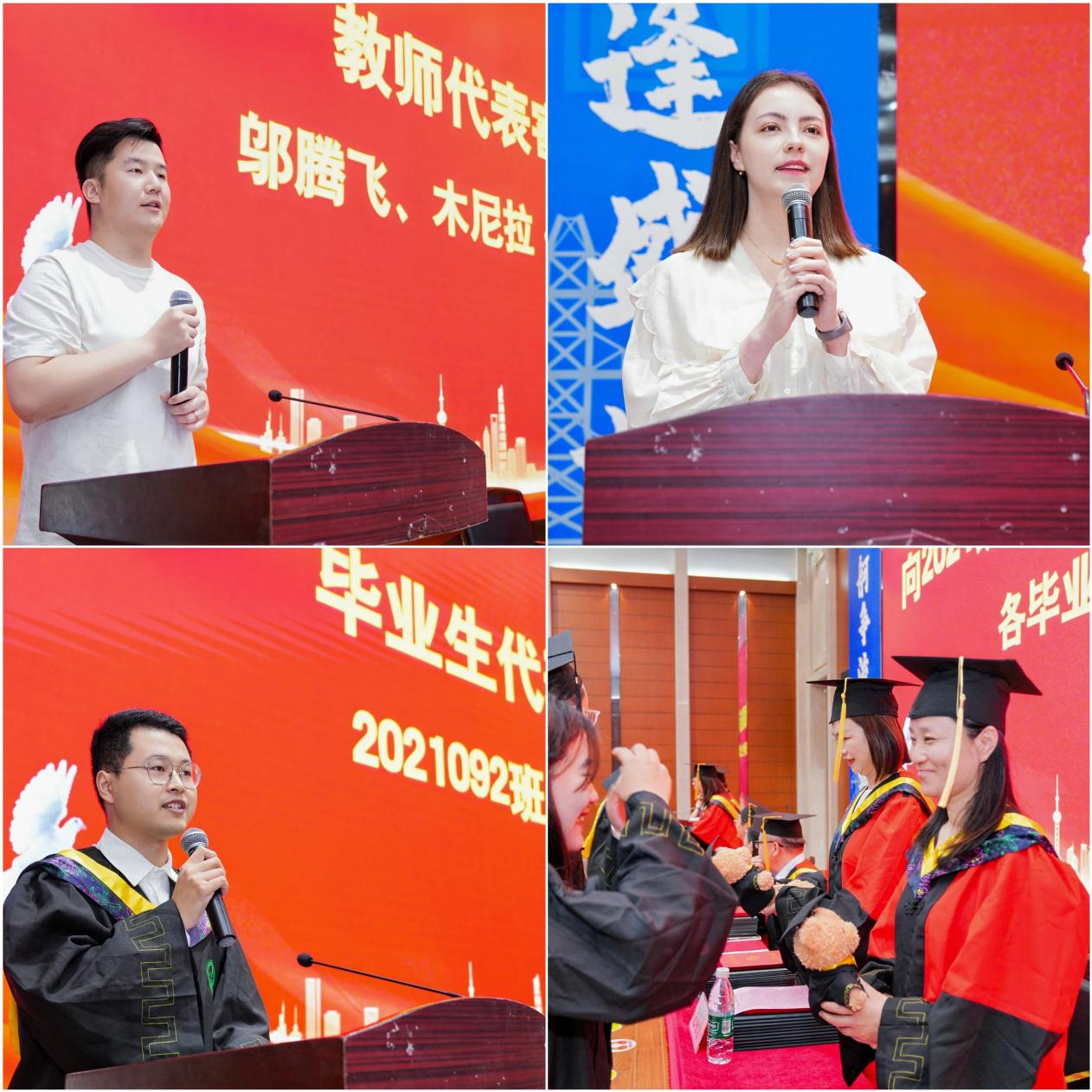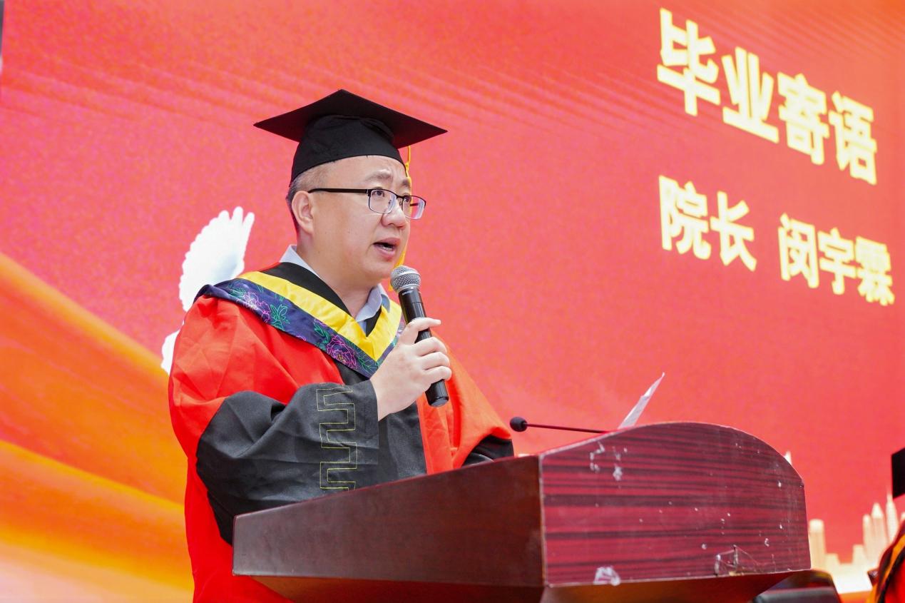 国歌与院训共话传承。在国歌声中典礼正式启幕。院长闵宇霖以院训“严谨、务实、责任、创新”为引,回顾学子们从初入校门到学业攻关的奋斗足迹,勉励毕业生在未来征途中继续绽放环化之光。教师代表邬腾飞、木尼拉深情寄语,叮嘱学子“在未知中坚守本心,在挑战中开拓新局”。毕业生代表林文涛回溯四载同窗岁月,誓言考研学子攀登学术高峰、参军毕业生守卫疆土、就业学子践行行业担当。毕业班学生代表向班导师赠送绣有班导师姓名与班级编号的定制小熊,传递“一日为师,一生为灯”的感恩之情。