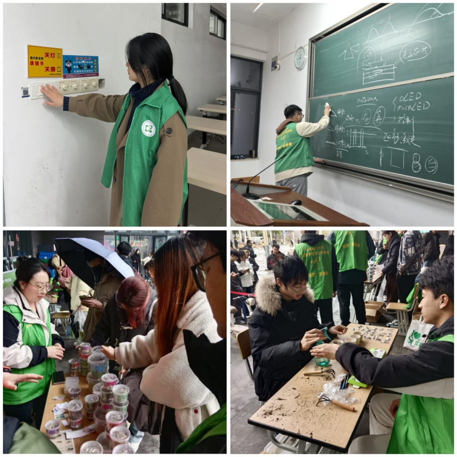 突出内涵特色,筑牢劳动教育“主阵地”。学院结合自身实际与校园文化建设需求,积极开展校园劳动实践活动,大力培育学生劳动文化。学院“砹水硒电”志愿服务队活跃在校园的各个角落,认真擦净黑板、关紧门窗、关闭电灯、检查水龙头,进行层层排查,及时上报问题并联系维修。通过这些行动,推动节水节电检查活动向可持续化、常态化迈进,引导师生从身边小事做起,为“双碳”目标贡献力量。雷锋月与植树节相遇,绿色行动如火如荼。植树节当天,学院在一食堂小广场举办节水节电和双碳知识科普宣传活动,提供绿植和特色花盆,邀请同学们参与种植体验。在志愿者的指导下,同学们亲手栽种并领养专属绿植,掌握养护知识,提升环保素养,为校园增添绿色生机,共建减碳校社。此次活动不仅丰富了校园文化生活,更通过劳动实践培育了学生的劳动文化,让绿色发展理念落地生根。