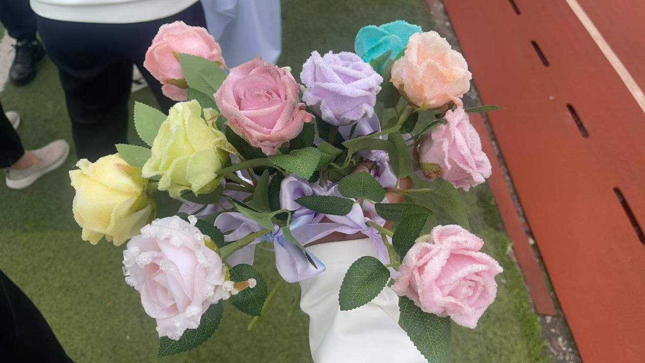 更引人注目的是教师方阵的创意展示——教师们手捧在实验室中自主结晶培育出的彩色晶体玫瑰,绚丽的蓝、紫、金色结晶在阳光下熠熠生辉。这些凝聚学科智慧的“永不凋谢的玫瑰”,既象征环化人对科学之美的追求,也寄托着对运动员们绽放光彩的真挚祝福。