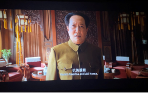 “雄赳赳,气昂昂, 跨过鸭绿江。保和平,卫祖国,就是保家乡。中国好儿女,齐心团结紧。抗美援朝,打败美帝野心狼!”