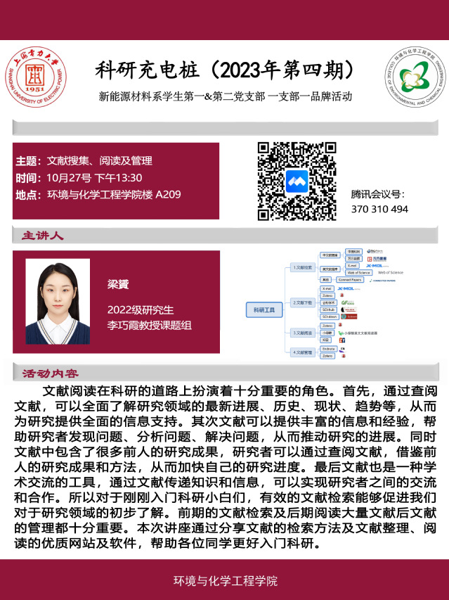 11月10日下午,新能源材料系学生第一和第二党支部在环化楼A209会议室开展了“科研充电桩”品牌活动的第四期——文献搜集、阅读及管理,分享会邀请了2022级研究生梁赟为大家分享文献的检索方法及文献管理、阅读的优质网站及软件。两个支部的全体党员参加了本次活动。